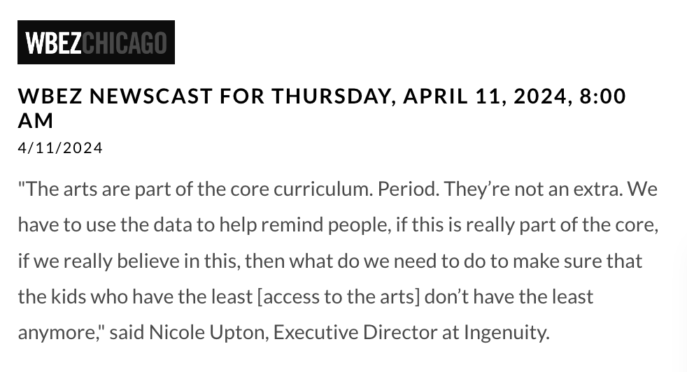 Producer for Ingenuity-Chicago: National Arts in Education Week, social media awareness campaign 2024